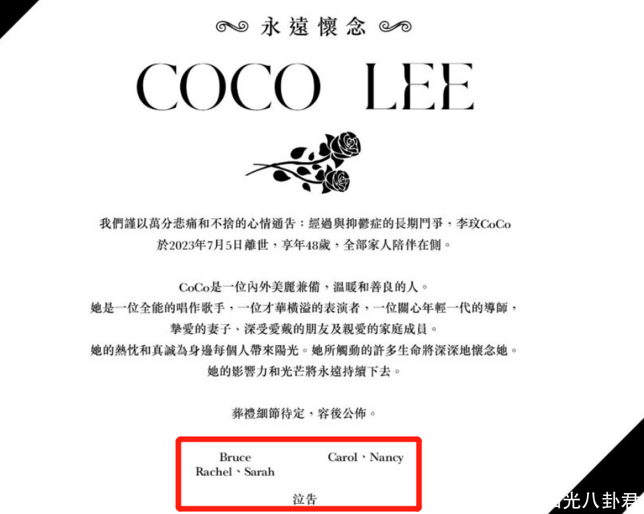 讣告中,提到李玟于2023年7月5日离世,享年48岁,一皆家东谈主跟随在侧。他也称赞浑家李玟是一位表里秀好意思兼备,温和柔顺良的东谈主。至于葬礼的细节讣告中只说待定,容后公布。