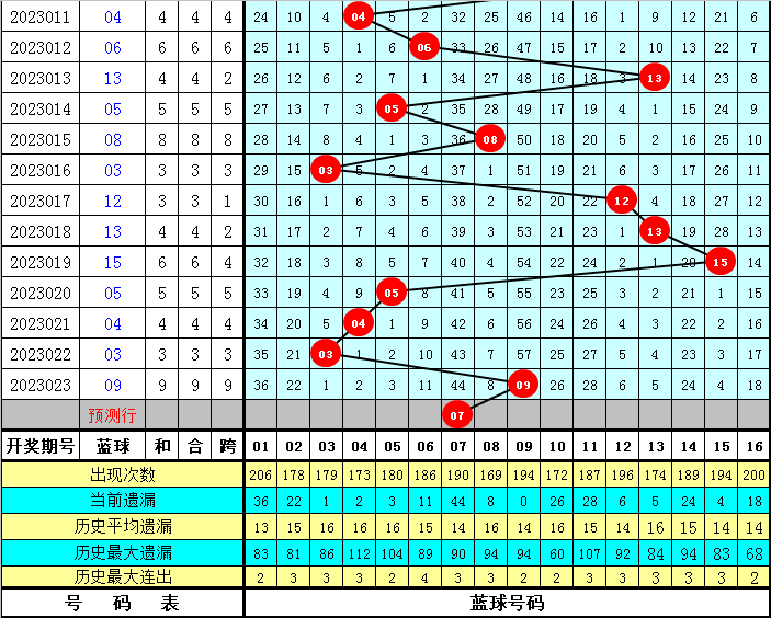 蓝球分析:旧年同时蓝球15为0路蓝球,在历史同时开奖中,蓝球号码012路比为7:7:6,其中0路号码和1路号码出现比例高达70%,本年同时瞻望蓝球链接走0路或1路,参考号码01 04 07 16。